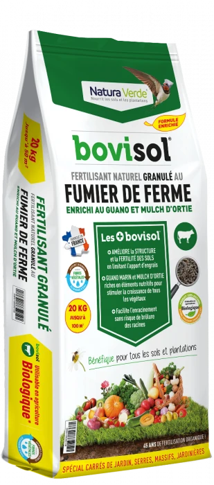 Ce fertilisant à base de fumier se mêle à la terre pour éliminer les graines de mauvaises herbes et les larves d’insectes notamment. Faciles à manipuler et à épandre, ces granulés s’utilisent en toutes saisons et offre tous les avantages du fumier sans ses inconvénients (propre, sans eau).