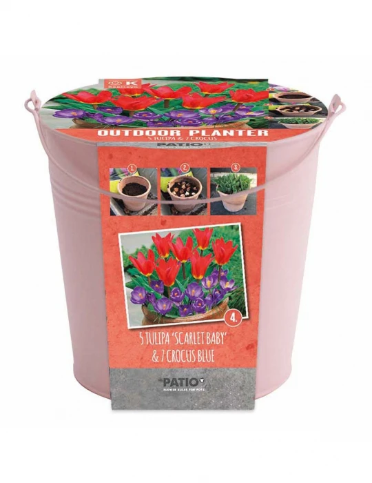 Ce kit contient un joli pot, ainsi que des bulbes pour effectuer une plantation à étages et profiter des jolies fleurs de tulipes rouges et de crocus bleus.